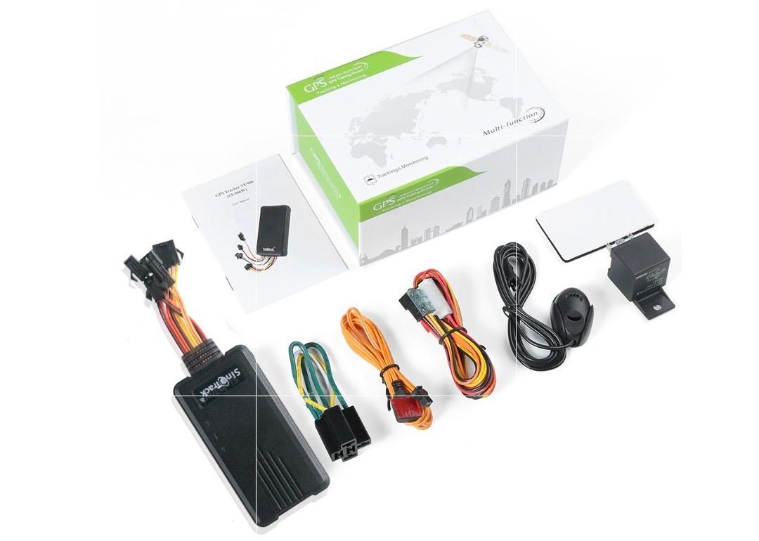 Sistema de rastreo GPS completo que incluye la unidad principal, antena GPS externa, cables de instalación, relé de corte de corriente, y control remoto. Ideal para instalación profesional en vehículos, permite monitoreo en tiempo real, geolocalización precisa, alertas de movimiento, y funciones avanzadas como corte de motor remoto para seguridad vehicular.